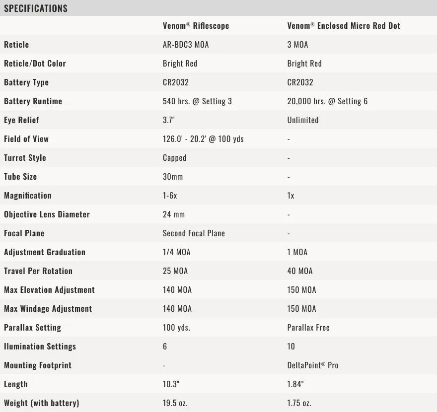 Αποκτήστε στόχο ταχύτερα με το Venom® Bundle. Προσυναρμολογημένο και έτοιμο για μηδενισμό, αποτελεί μια ολοκληρωμένη τακτική διαμόρφωση με αξιοπιστία «εργαλείου δουλειάς» και ακρίβεια που δεν θα σας απογοητεύσει.