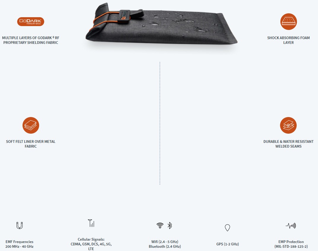 GoDark Faraday Bags are military strength Faraday bags that protect your phone, tablet and other electronics from location tracking, hacking, and damage by blocking all incoming and outgoing EMF signals between 200 MHz and 40 GHz, including GPS, Cell Phone, Wi-Fi and Bluetooth.